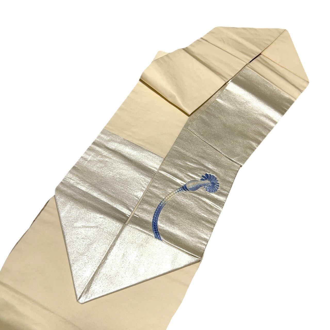 【L1202】名古屋帯 名古屋仕立て シルバー 青 362cm 小紋などのふだん着物に