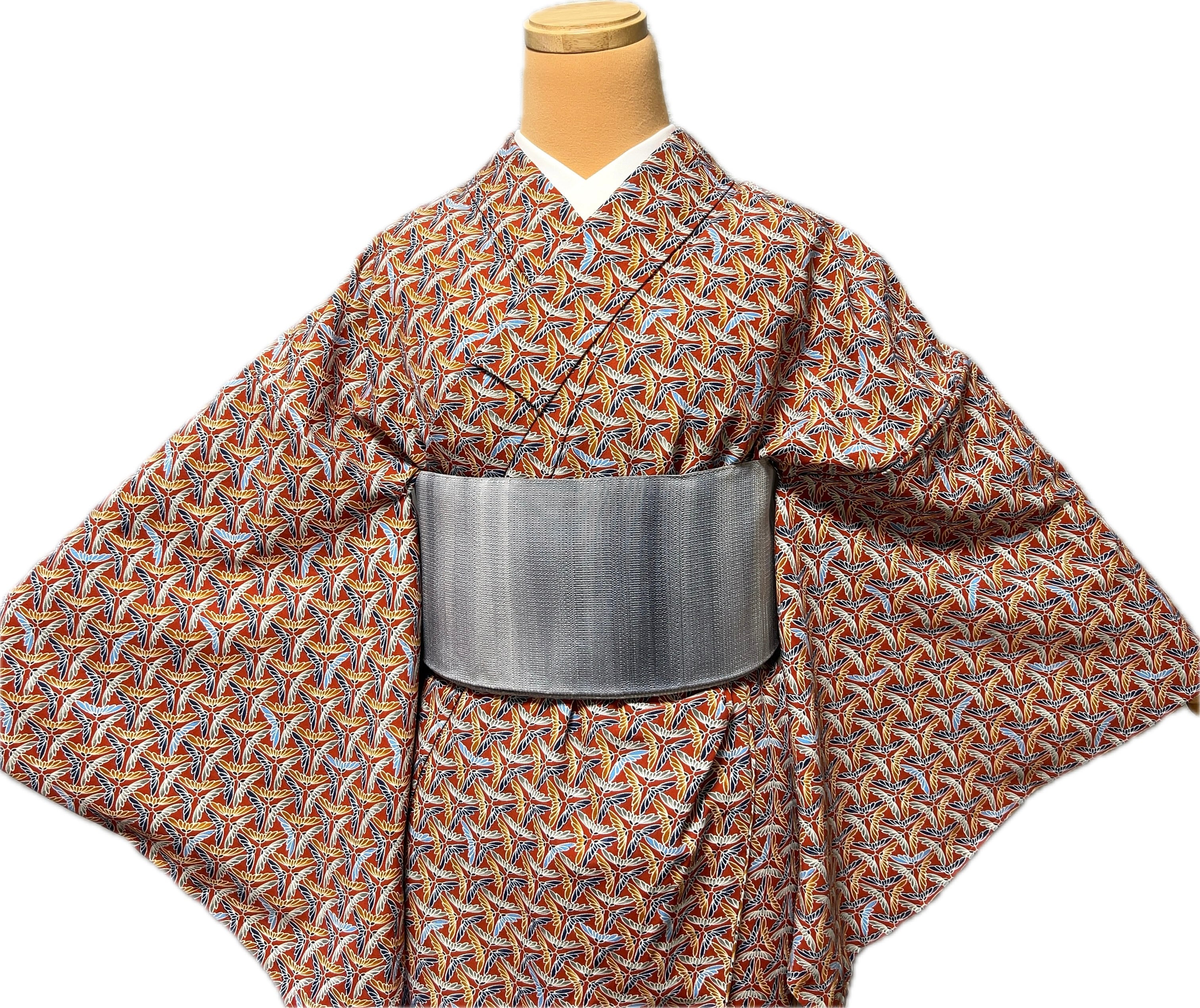 【L1235】洗える着物 小紋 化繊 赤茶 対象身長~167cm 初心者応援価格!!