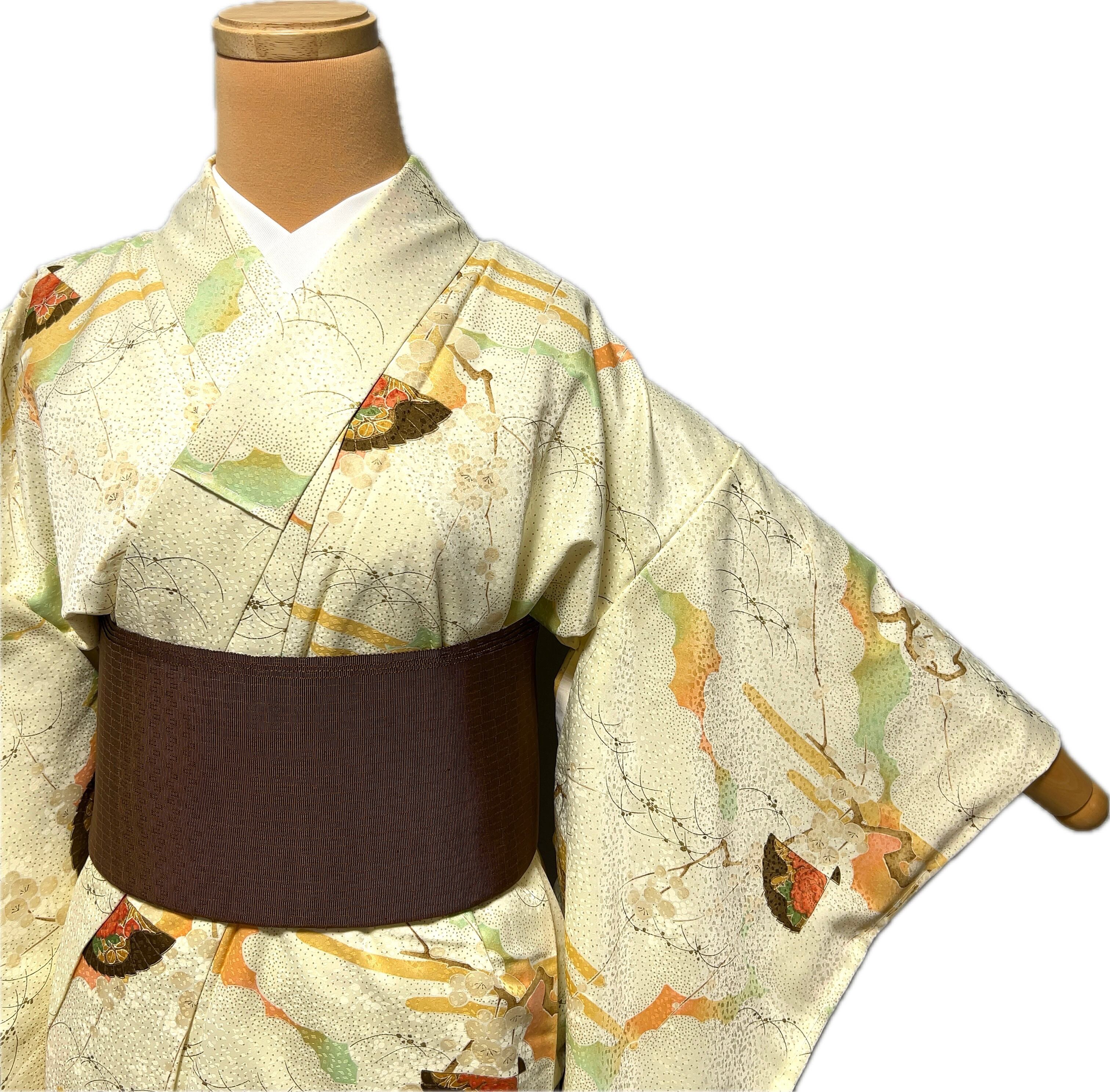 【L1239】洗える着物 小紋 袷 化繊 肌色 茶オレンジ 緑 対象身長~157cm